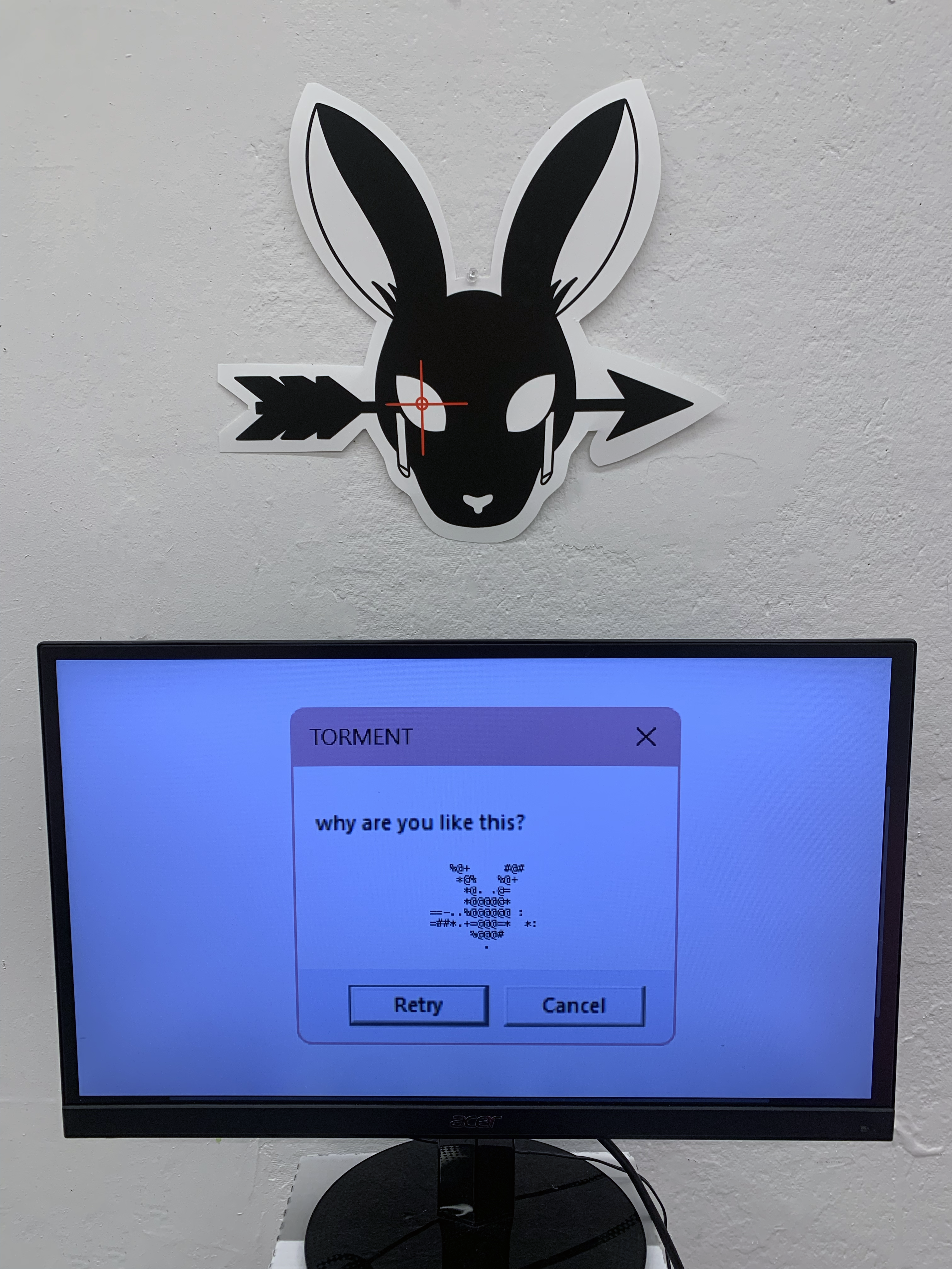 info: torment. is a piece created in response to a vandalism incident that occurred this past semester. Hardly do I create work based off of more traumatic experiences, but was looking to art as a response to manage myself through it. The multimedia piece shows a rabbit, typically seen as prey animal, with an arrow through its head. There are tears and a scope sight within the rabbits eyes. On the monitor beneath is a text box with a prompt and an ASCII version of the digital bunny, with a vague question asking ‘why are you like this?’ This question was directed to myself, as to say what I could have possibly done to have someone think it was alright to put me through such a situation, or to avoid it all together, but can also be an open ended question for the audience. The only two options are Retry and Cancel, as there is no option such as Okay to accept this question in any way.